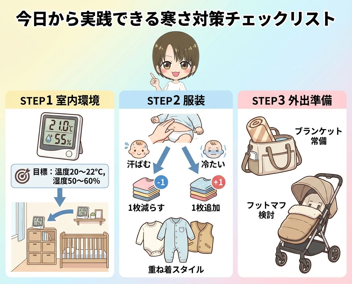 今日からこれらの対策を実践することで、赤ちゃんもあなたも、より快適な冬を過ごせるようになります。最初は大変に感じるかもしれませんが、慣れてくれば自然と適切な判断ができるようになります。赤ちゃんの成長とともに、あなたの育児スキルも確実に向上していくのです。