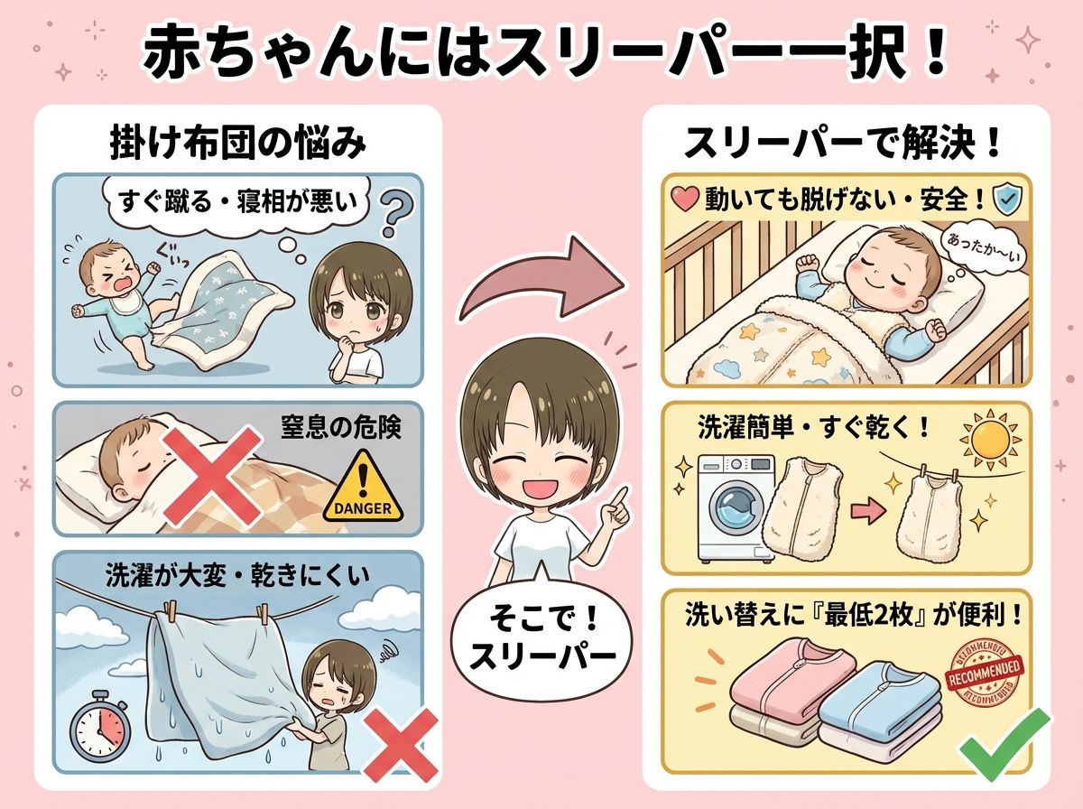 スリーパーの利点は、単に布団が蹴られない、ということだけではありません。育児生活全体を大きく改善する、数多くのメリットがあります。